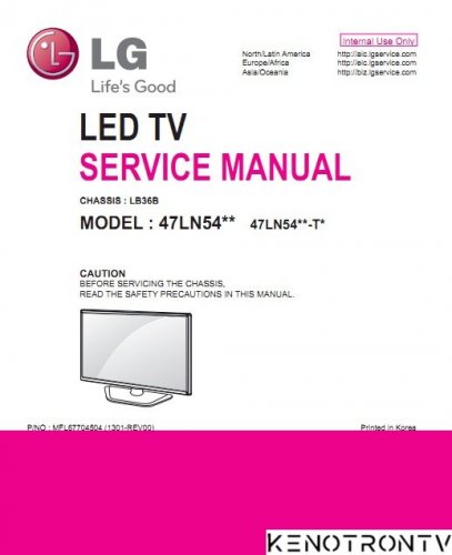 LG 47LN54xx chassis LB36B Service Manual Main SOC S7LR_M1 (MDS804KKX) (IC101) STA380 (IC3401) IC802 BD82020FVJ TU3700 TDSS-G201D TUNER_OPT TU3702 TDSH-G501D TUNER_ISOLATOR_DVB_1INPUT_H SFLASH_NON_OS_WINBOND IC5501 W25Q64FVSSIG SFLASH_NON_OS_MX IC5501-*1 MX25L6406EM2I-12G SFLASH_OS_WINBOND IC5501-*2 W25Q80BVSSIG SFLASH_OS_MACRONIX IC5501-*3 MX25L8006EM2I-12G Что нового в этой версии Service Manual (Посмотреть все изменения) CHASSIS : LB36B MODEL : 47LN54** 47LN54**-T* CAUTION BEFORE SERVICING THE CHASSIS, READ THE SAFETY PRECAUTIONS IN THIS MANUAL.